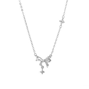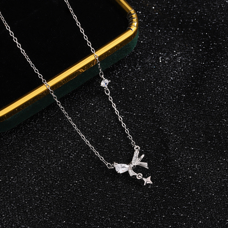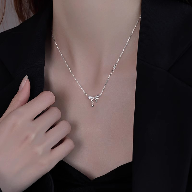 Sterling silver bow necklace for women, fresh and elegant zircon fairy-style choker, fashionable starburst collarbone chain.