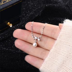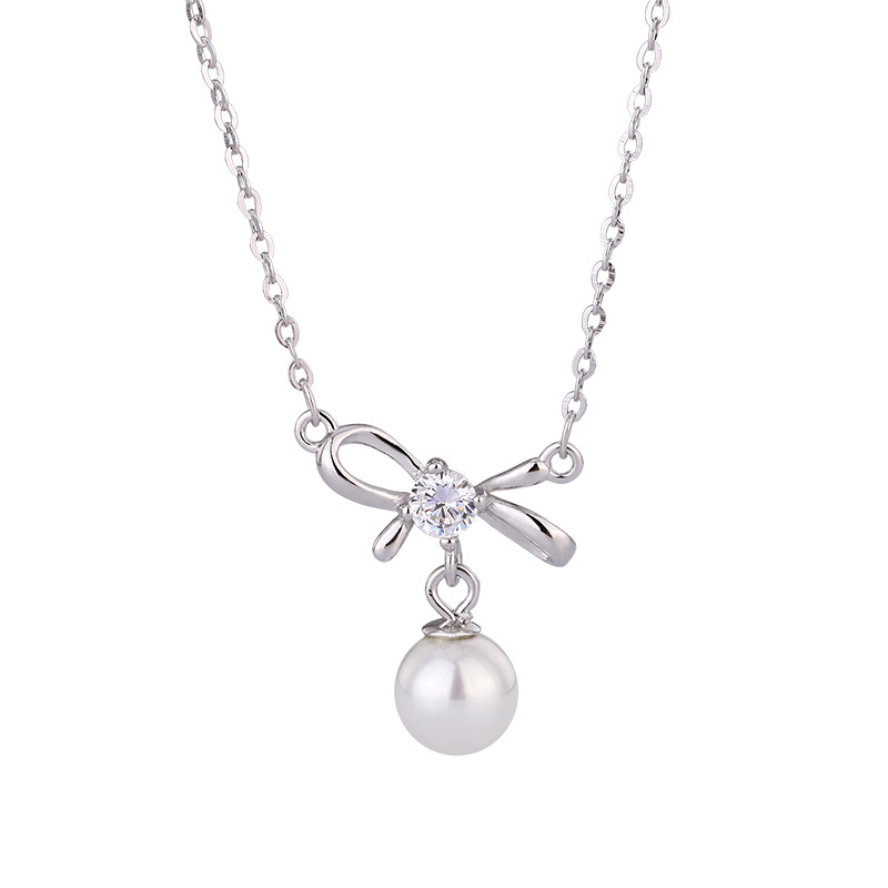 Sterling silver bow necklace for women, vintage style, imitation pearl and zircon choker, high-end clavicle chain.